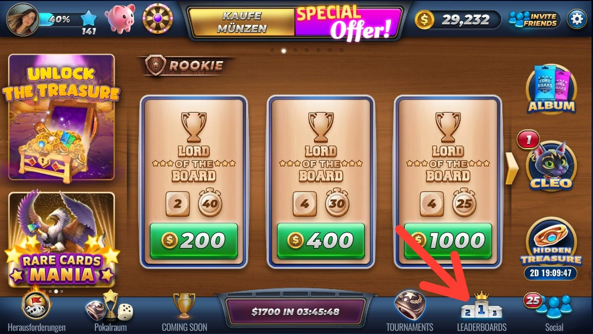 Um die Rangliste Ihrer Freunde im Spiel zu überprüfen und festzustellen, wer der Backgammon-Meister ist, klicken Sie im linken Menü auf "Bestenliste".